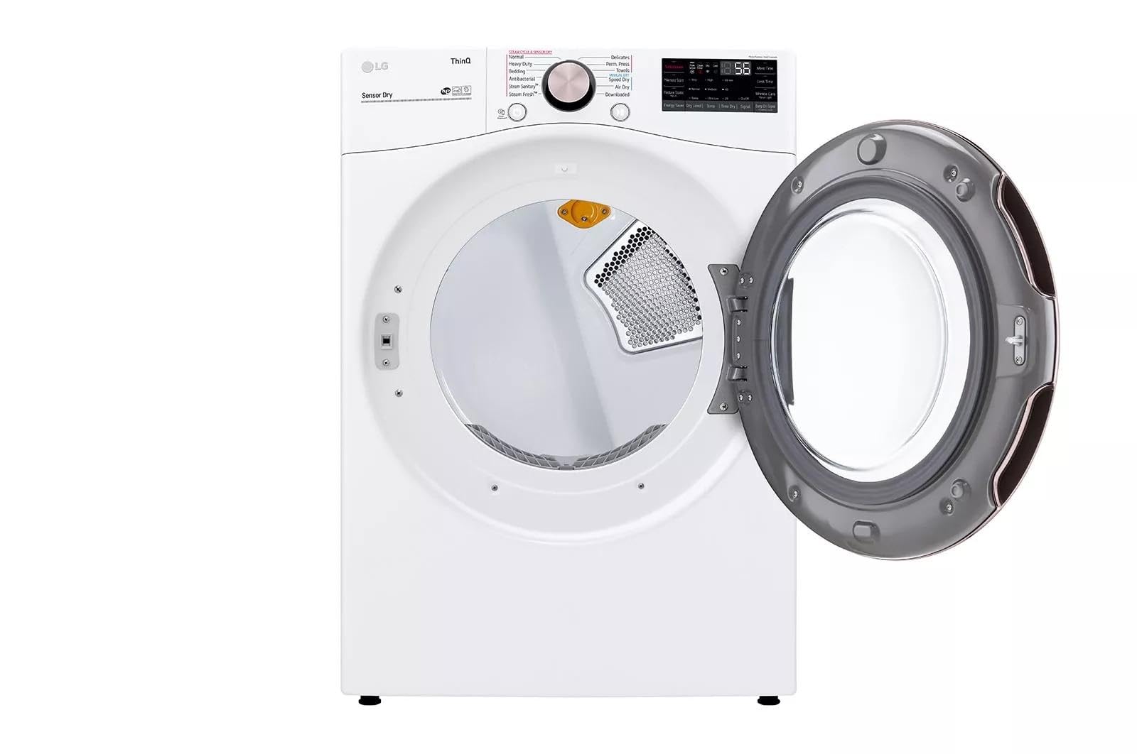 The LG Ultra Large Capacity Smart Front Load Gas Dryer has a 7.4 cubic feet capacity with TurboSteam technology. It features built-in intelligence and is Wi-Fi-enabled.