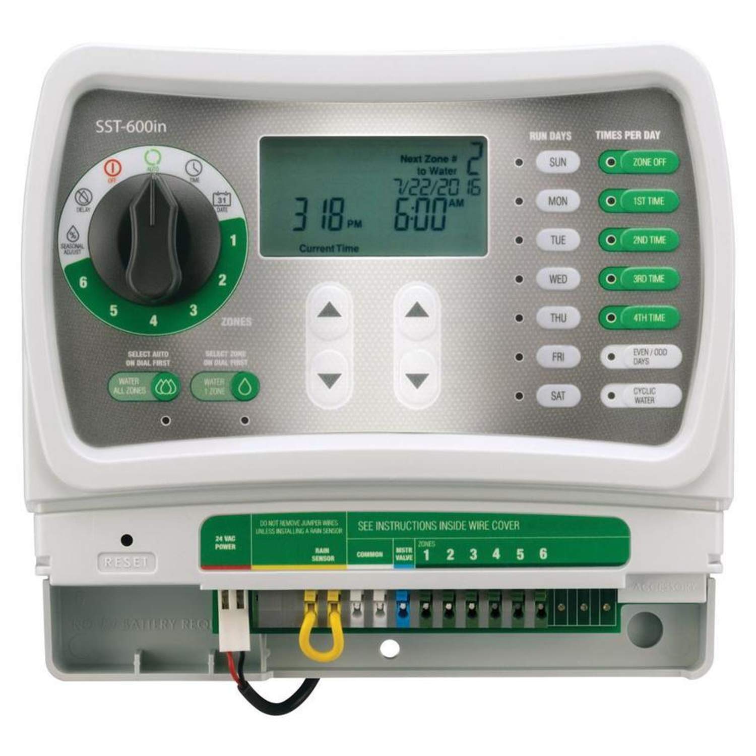1 irrigation controller This indoor-mounted timer is so easy to use you can forget the instructions. Its intuitive zone-by-zone scheduling allows you to set watering times differently for each area of the yard, providing greener results with less water. By turning the dial to each zone, you can easily set custom days of the week, odd or even days, or a cycle number of days independent of all other zones. You can also set up to four different custom watering times of the day to water slopes and clay soils in short intervals to allow water to soak in and avoid runoff. Each zone's settings can be reviewed quickly with easy to read LED indicator lights.